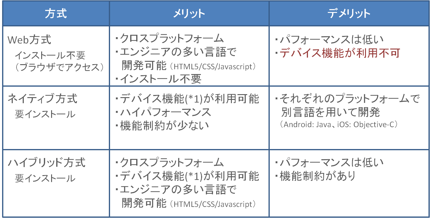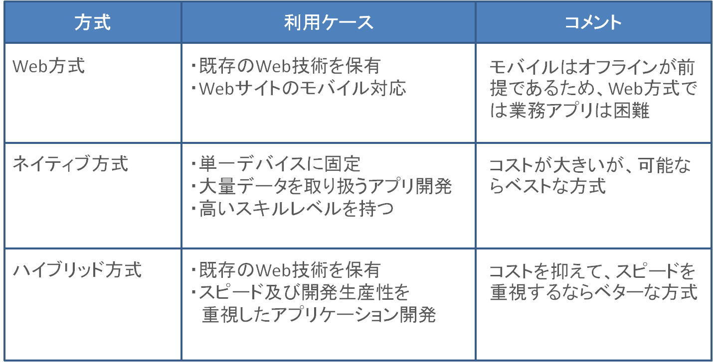 ネイティブ方式とハイブリッド方式は、モバイル・アプリケーションとしてAppStoreやGoogle Play(旧Android Market)などからダウンロードして、デバイスにインストールする形式のアプリケーションです。この2つの違いは開発の方法が違います。 ネイティブ方式の開発方法は、iOSであればAppleが提供しているXcode上でObjective-Cという言語を利用して開発し、AndroidであればGoogleが提供しているAndroidSDKを使ってJavaで開発することになります。その他のプラットフォームもそれぞれの言語を利用して開発することになります。メリットはハイパフォーマンスであり、細かい開発も可能で、カメラやセンサーなどをコントロールできるという点です。 では、ハイブリッド方式とは、Web方式のHTML5などを利用して、1つの言語でAndroid・iOSなどのプラットフォーム上で動くアプリを作れるための開発ツールです。これももちろんカメラやセンサーなどをコントロールできるように開発ツール側で提供されています。但し、ネイティブ方式ほどはハイパフォーマンスではありませんし、機能制限もあります。ただ、マルチプラットフォーム対応をする必要がある場合には、生産性という面で非常に優れています。 ちなみに、Facebookモバイルアプリもハイブリッド方式で開発しているとのことです。 http://www.readwriteweb.com/mobile/2011/...design.php このことを考えると、ネイティブアプリで、iOSのObjective-CやAndroidのJava、さらには他のプラットフォームの技術を理解しているエンジニアを多く集めることは非常に難しいのではないかと思います。そのため、デスクトップやWebアプリと共通の技術で開発できるハイブリッド方式というものは、企業が導入するためにも重要な要素となってくるのではないかと思います。個人アプリを作るのであれば、個人の力でいくつかの技術を習得できれば開発できますが、企業のアプリですと、大人数のエンジニアを必要とするケースが多く、ネイティブで開発して、その後保守していくのはコスト的に負担が大きいかもしれません。 もちろん、そういった懸念事項を解消できるのであれば、ネイティブ方式がハイパフォーマンスかつ細かい実装も可能ですので、個人的にお勧めです。 下に3つの方式をまとめておきました。 また、利用ケースもまとめておきました。これ以外にもあると思いますのでコメントいただければと思います。(個人的な視点も入っていますので参考まで。) ハイブリッド・モバイル・アプリケーション開発ツール Web方式を選択した場合は、基本的には従来の開発ツールと同様です。 ネイティブ方式を選択した場合、基本的に開発ツールは、iOSならXcode、AndroidならEclipseを利用することになると思います。 ハイブリッド方式を選択した場合、いろんなモバイル・アプリ開発ツールがあります。例えば、以下のようなものです。