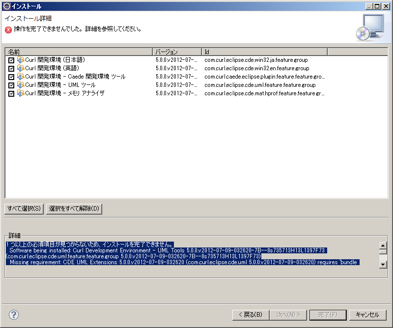 エラーは全部チェックしていたことによるものでしたね。 ■ Curl開発環境 ■ Caede開発環境ツール だけチェックをつけたらインストールできました。 使えないのであればUMLツールやメモリアナライザはリストから外せばよいのではと思いました。 が、Eclipseを起動してみるとCurl関連のメニューが追加されてません。 上記のインストール自体はできているようですが、メニューに追加されていないため、新規-Curlプロジェクト がありません。 |