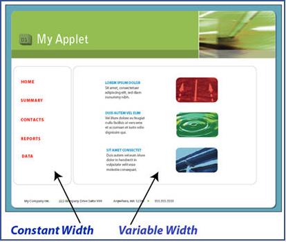 Wouldn't it be easy if everyone had the same size monitor and same resolution? Fortunately, Curl makes it easy to build applications that stretch and compress. It is common to have fixed graphical elements in your applet, as well as elements that stretch and compress with the browser window.