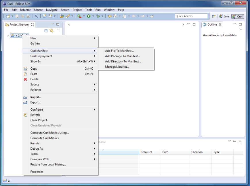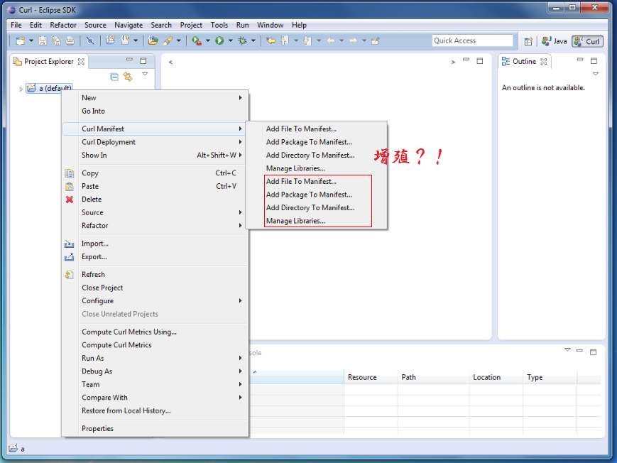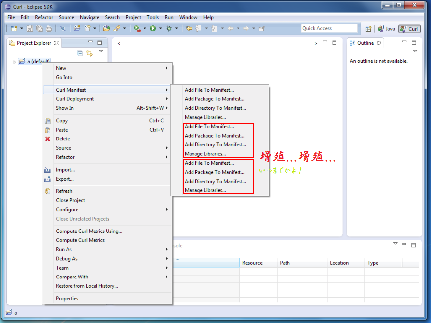 余計なことはともかく、とりあえず試してみろ!っていう感じだと思いますので、Eclipse4.2M5 さっそくダウンロードして、CDE をインストールしました。特に違和感無くインストールできましたし、簡単なCurlプロジェクトサンプルも問題なく作成できました! 簡単やん!Curlのプロジェクトにパッケージを追加しようと思って、右クリックメニューのマニフェストをクリックしてパッケージを追加した、全く問題なし!これだ: パッケージをもう一個追加しよ!ってまた右クリックし、マニフェストメニューを選択したら、あらら!こうなった: もうしかして、これはCDEのバグ??もう一回やってみよ: うん、バグっぽいですね、ちょっと残念でした... でも今のところ問題が発見でき、逆に考えればよかったかもね。さっそく担当者に連絡して対応してもらおう...。(ちゃんとEclipse4.0をサポートしていく予定ですのでご安心を!!また、今のところ簡易なテストを実施したのですが、大きな問題はこれぐらいです。) |
