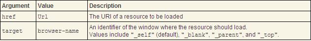 Tip: Note that link and browse-url each have two arguments: href and target. A link renders as text that is underlined for the user to click on, while browse-url is used as a function that can be called in any graphical object's event handler.